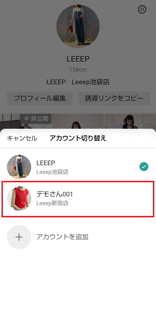 ※切り替えたいアカウントが表示されていない場合は、「アカウントを追加」ボタンをタップし、LEEEPにログインしてください。