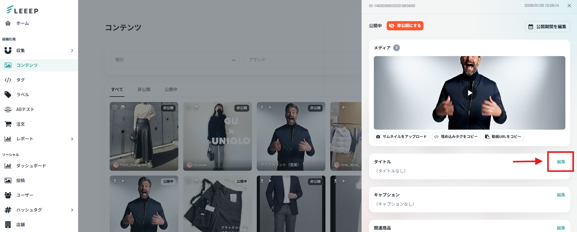 管理画面「コンテンツ」ページにて、動画のタイトルを変更することができます。<変更手順>①該当する動画コンテンツをクリック>タイトル右横の「編集」をクリック②タイトルを編集部分より、タイトルを入力③「保存」ボタンをクリックして完了です。