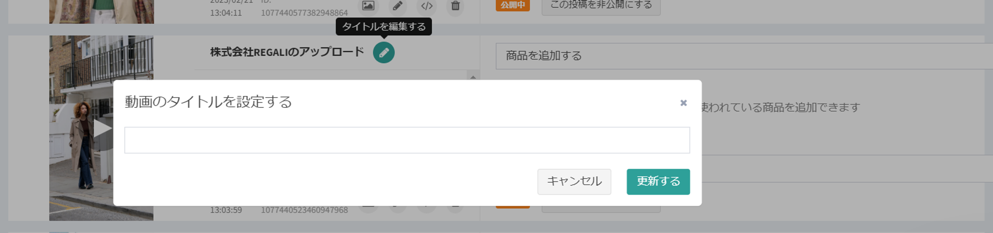こちらからタイトルを変更したい動画コンテンツを選び、「○○のアップロード」の右横にある「鉛筆マーク」をクリックしてください。運用する上で区別しやすいタイトルを入力していただき、「更新する」を押下しますと設定内容が保存されます。