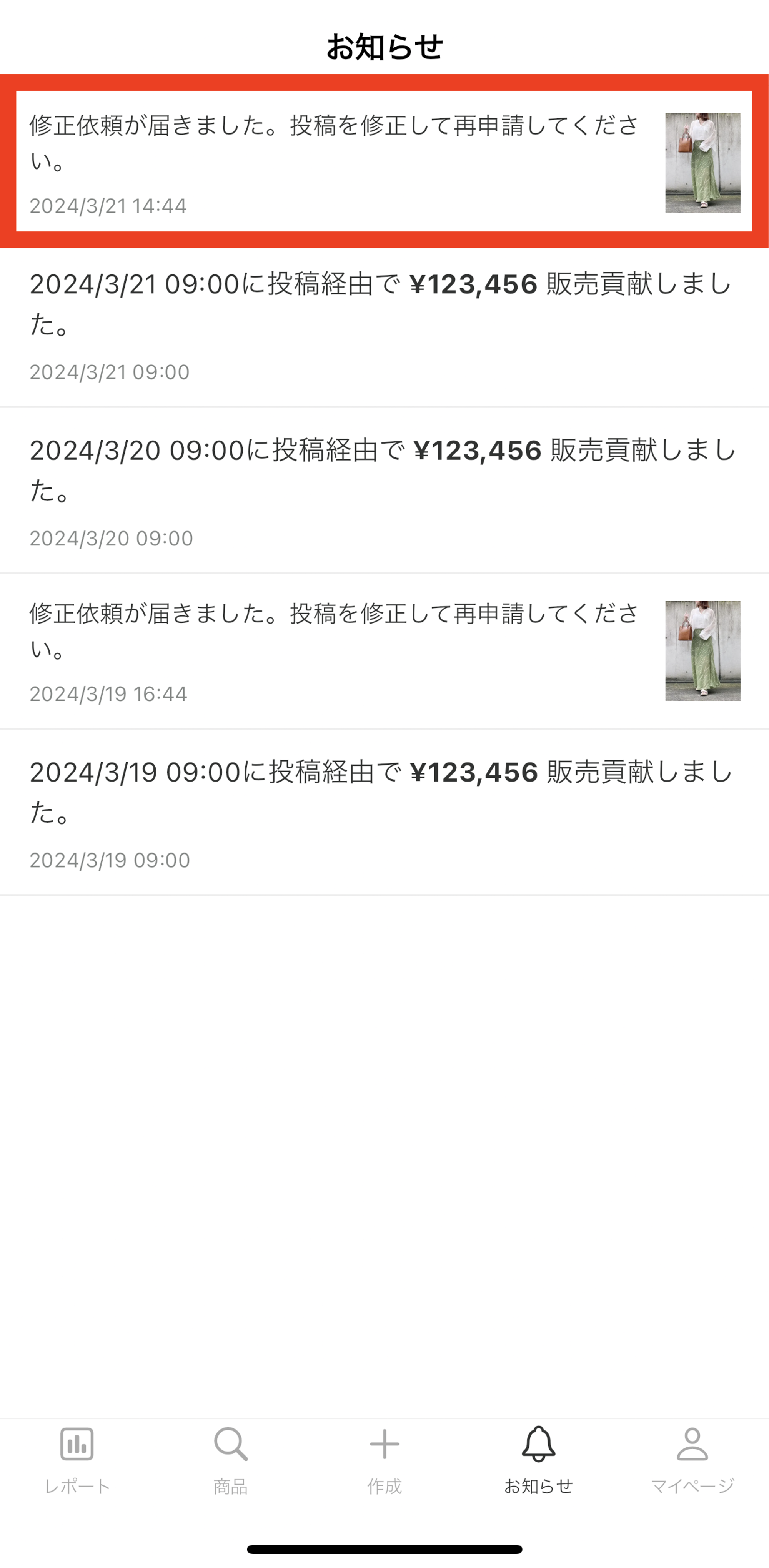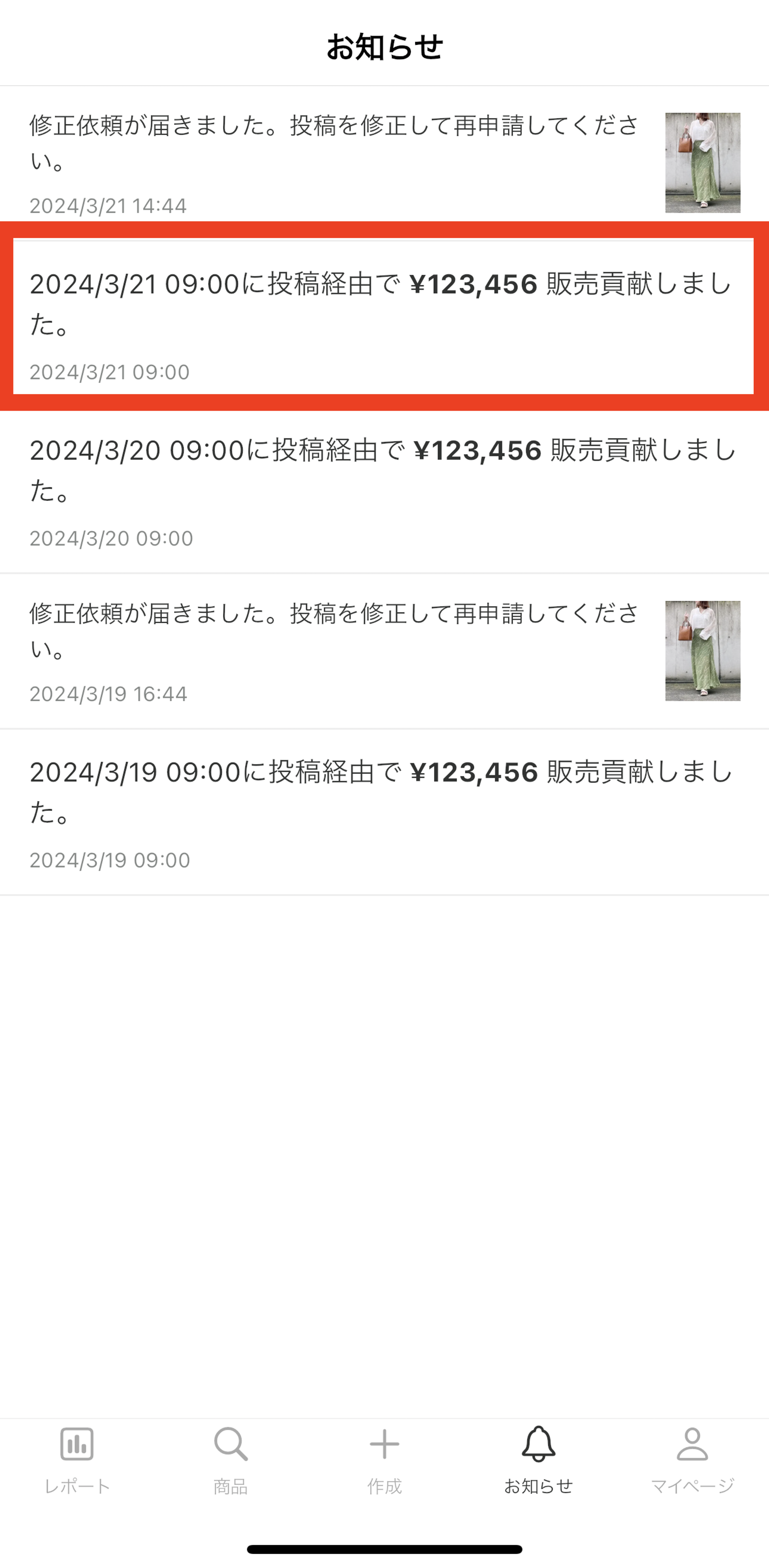 コンテンツ経由で販売貢献をした場合、1日1回お知らせ欄に売上の合計金額が表示されます。