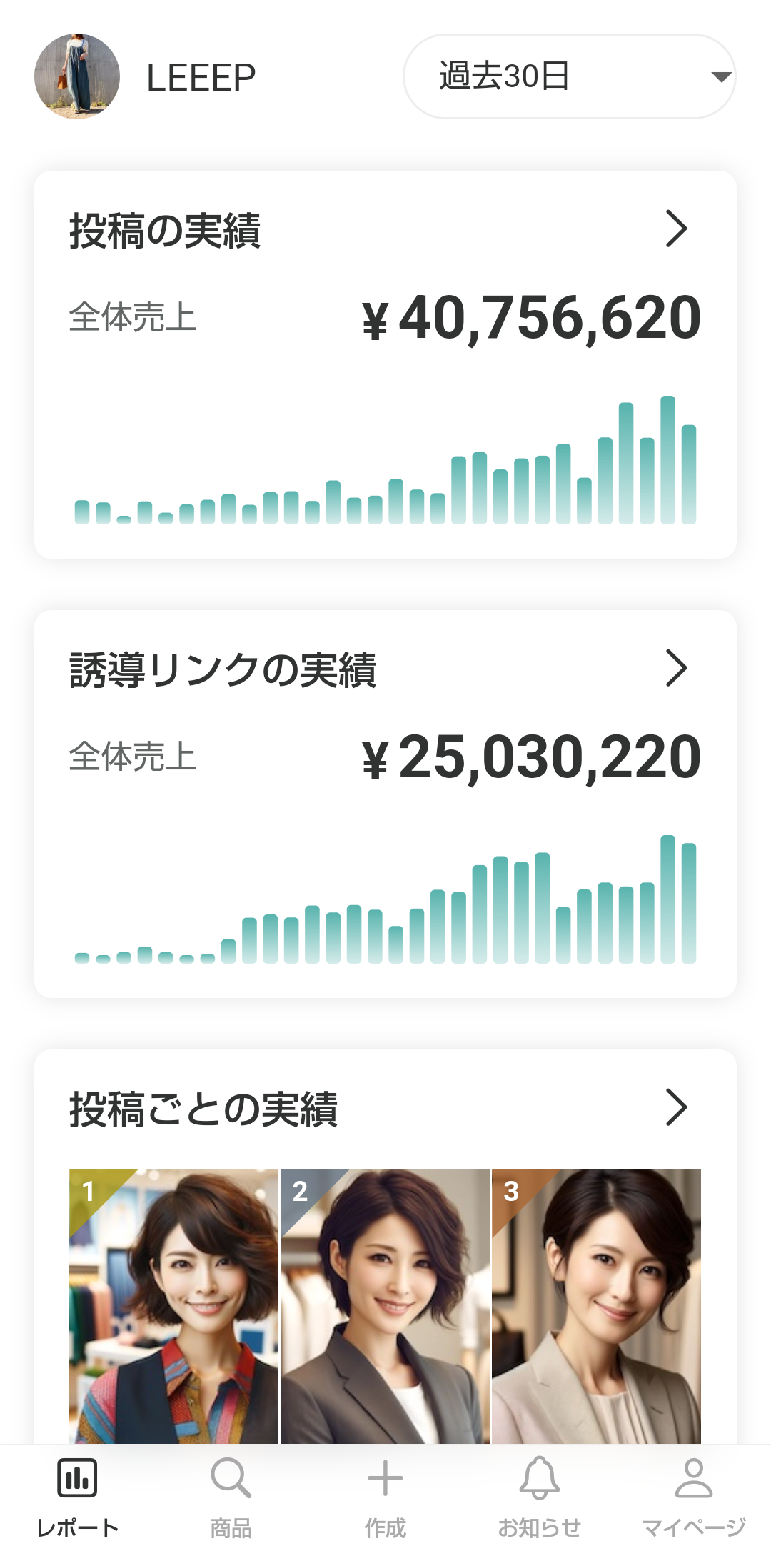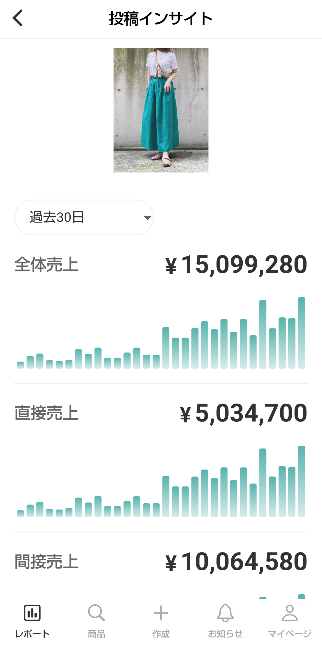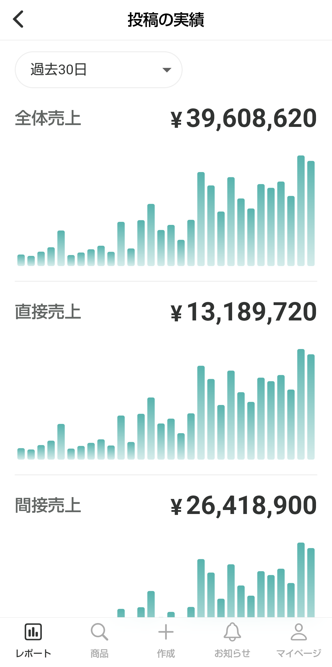 売上 | 選択した期間内に、各投稿を経由して発生した全体売上が表示されます。 |