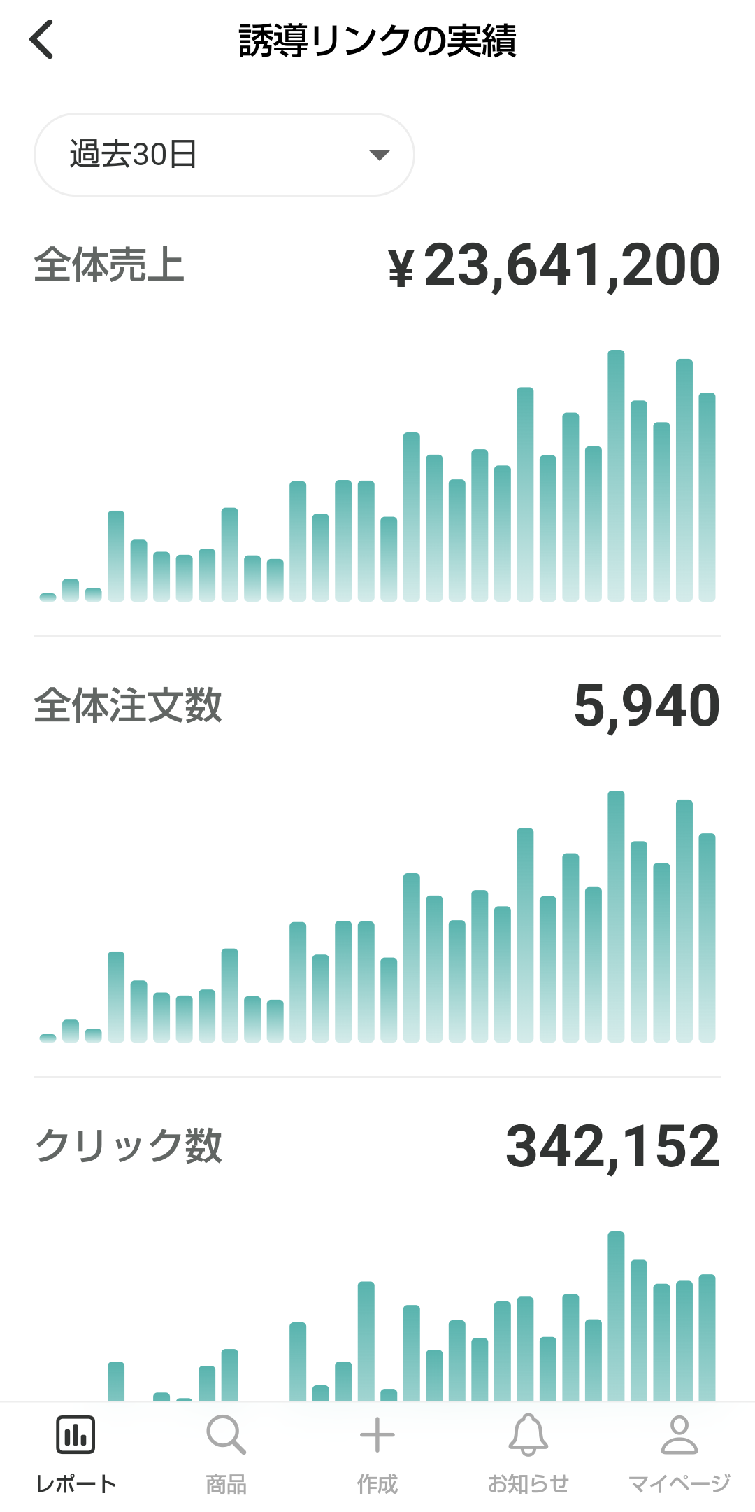 期間中の売上、注文数、閲覧数、注文率のレポートを確認いただけます。