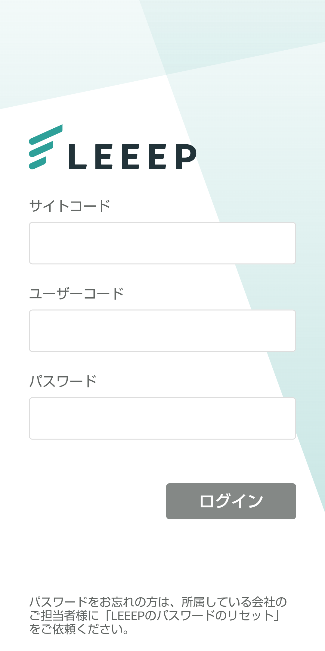 アプリにログインするには、サイトコード*1、ユーザーコード、パスワード*2が必要です。※アプリをまだお持ちでない方は、アプリダウンロードを先に行ってください。ログインの手順1.管理者から伝えられた「サイトコード*1」「ユーザーコード」「パスワード*2」を記入してください。2.[ログイン]をタップします。※1:サイトコードはLEEEP管理画面>アカウント情報よりご確認いただけます。LEEEP管理画面へのアクセス権限がない方は、所属している会社のアクセス権限を持っている管理者様にお問い合わせください。※2:初回ログイン時の「パスワード」は、「ユーザーコード」と同じになります。