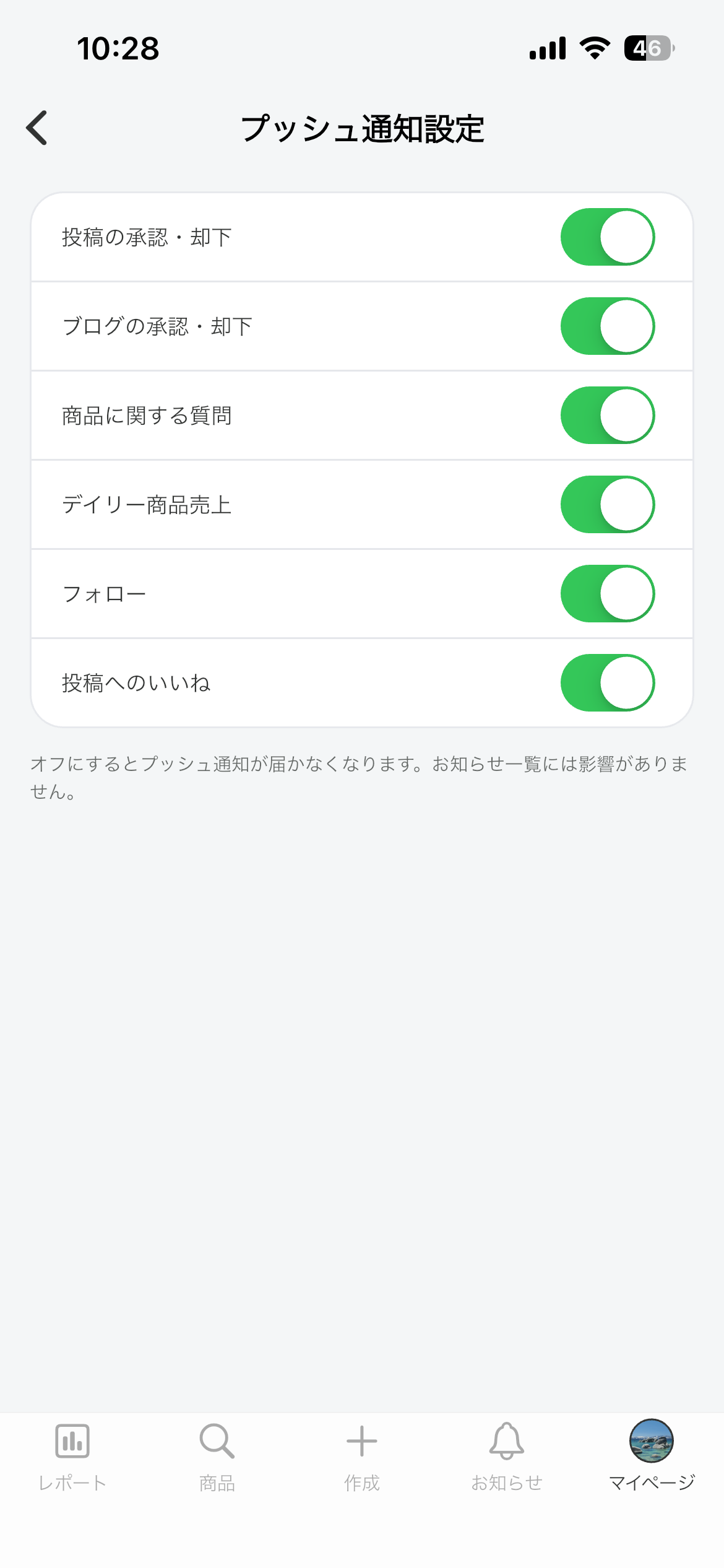 通知を受け取りたい項目をON(有効)に、不要な項目をOFF(無効)に切り替えます。