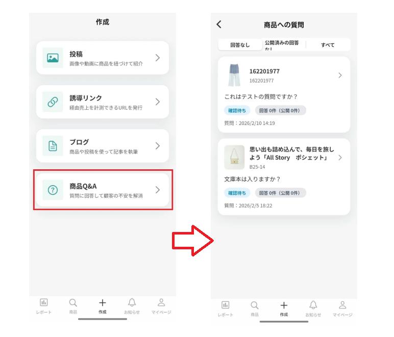 アプリの作成ページから「商品Q&A」を選択すると、質問一覧画面が表示されます。