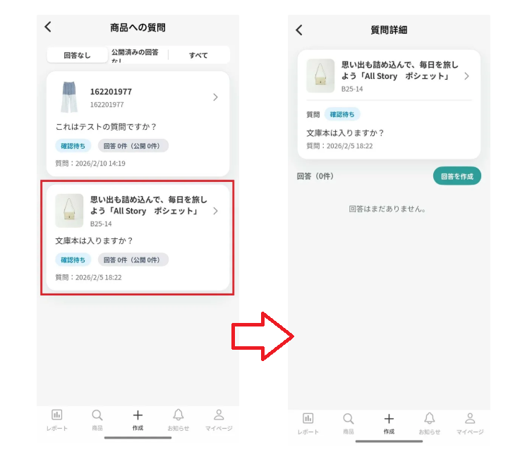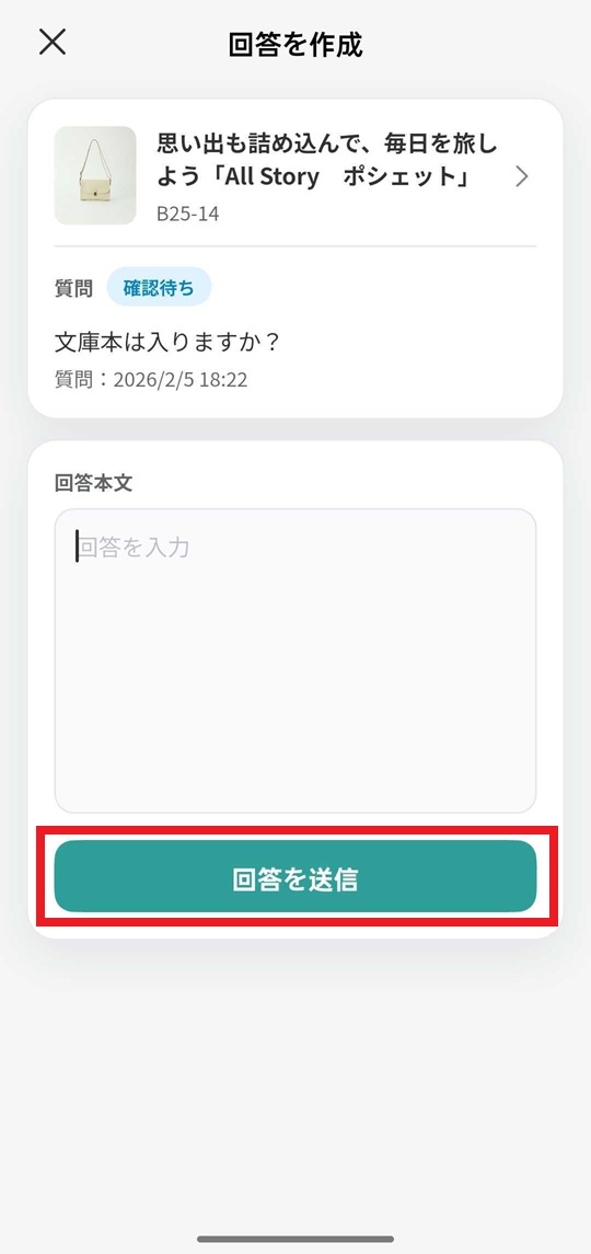 送信が完了すると、回答作成画面が自動的に閉じられ、質問一覧画面に戻ります。
