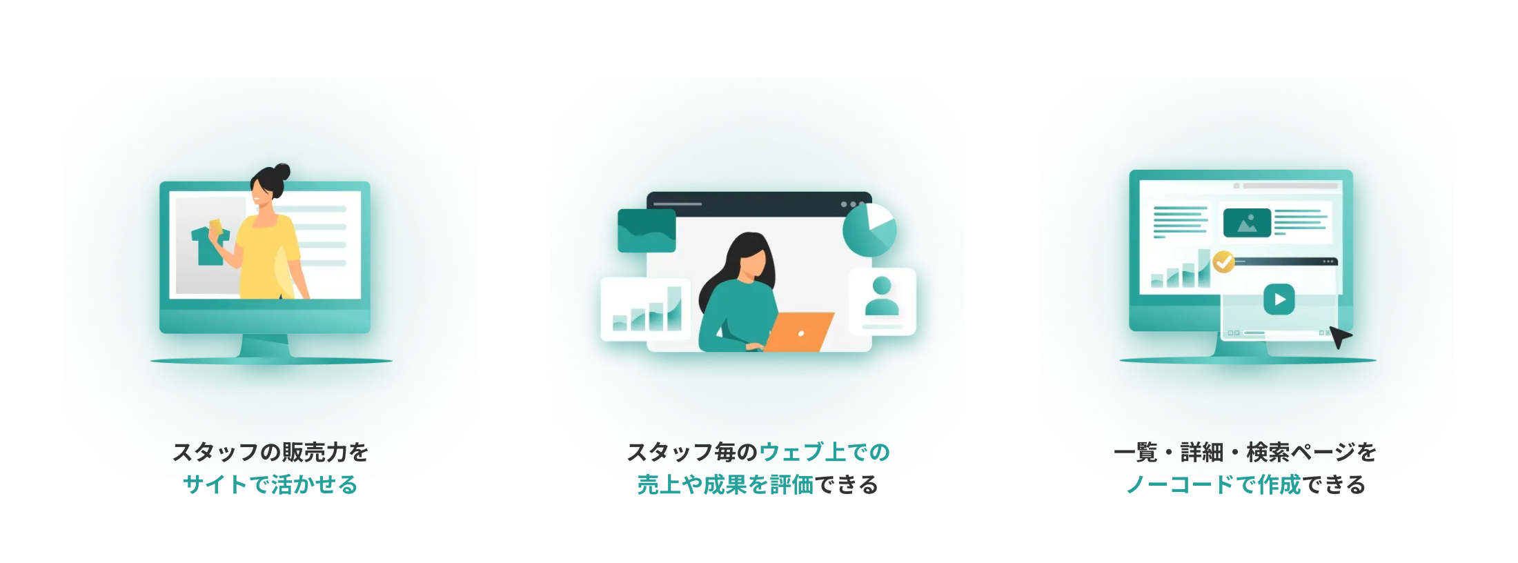 スタッフの投稿や動画をサイト上で活用したり、スタッフのサイト上での販売効果を可視化をするなど、ウェブ接客の促進をサポートします。