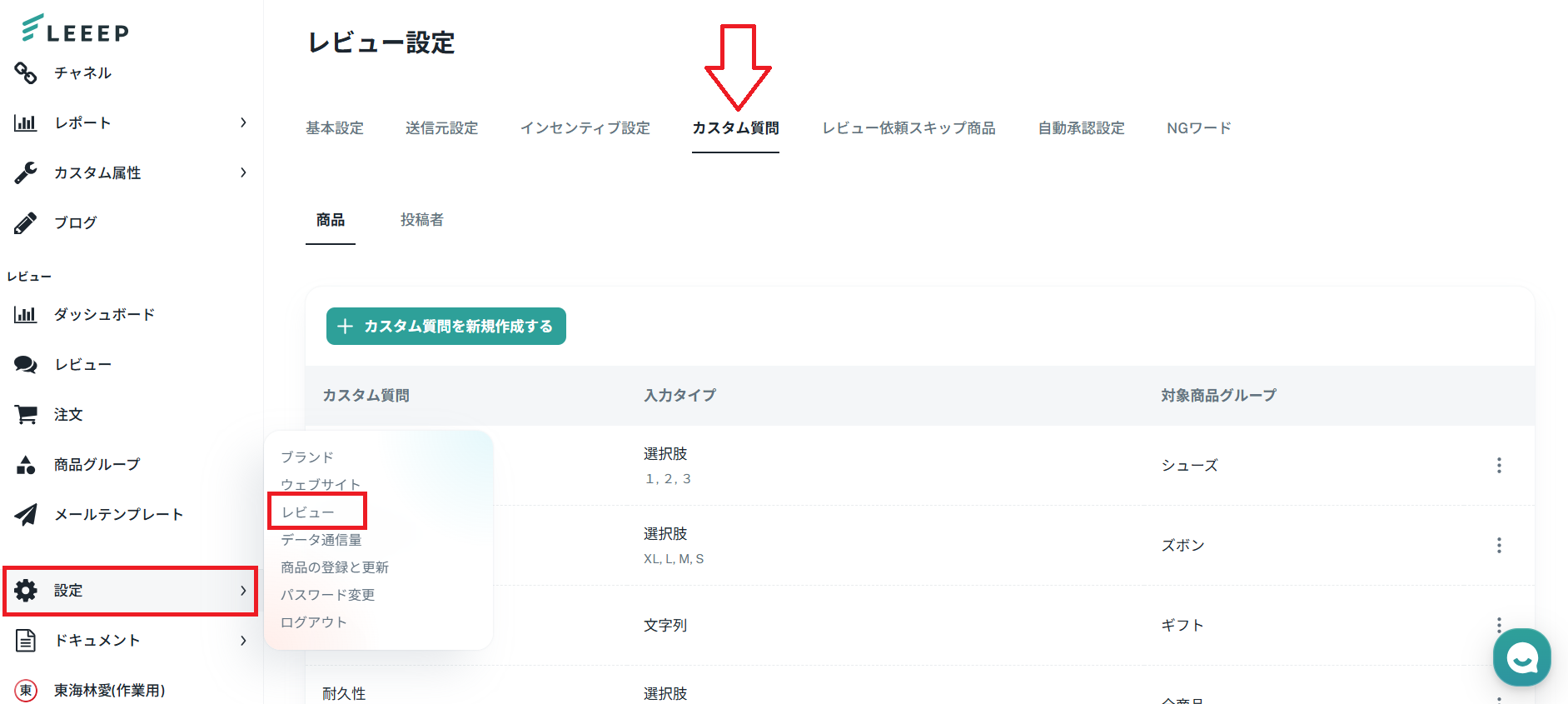LEEEP管理画面: 設定 > レビュー > 「カスタム質問」タブ