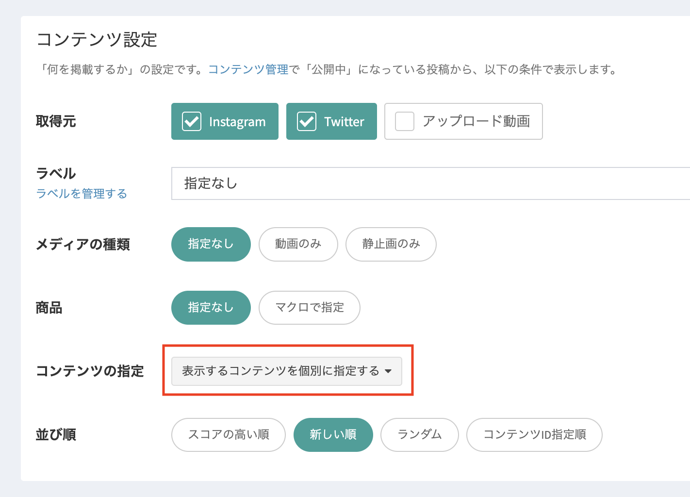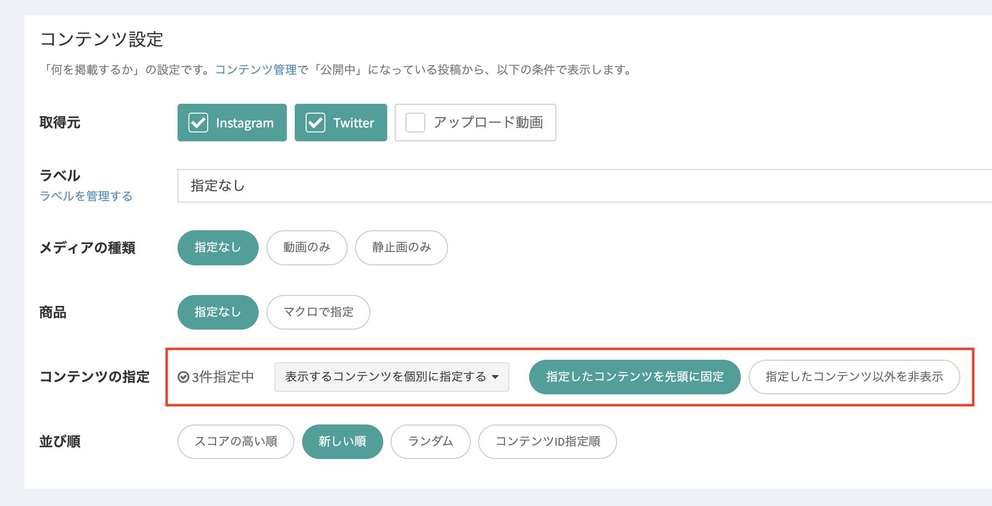 コンテンツを1件以上指定していると「先頭に固定」「以外を非表示」が選べるようになります。