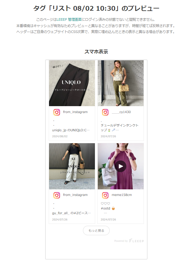leeep_test=onを追加した場合のみタグが表示されます。本番サイトで動作を確認したいが、まだ一般のお客様には見せたくない場合にご利用ください。非公開:タグは表示されません。※プレビュー機能は利用不可