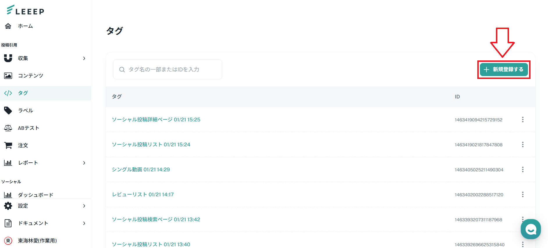 管理画面の左メニューから [投稿引用] > [タグ] を選択し、タグ一覧画面を表示します。
