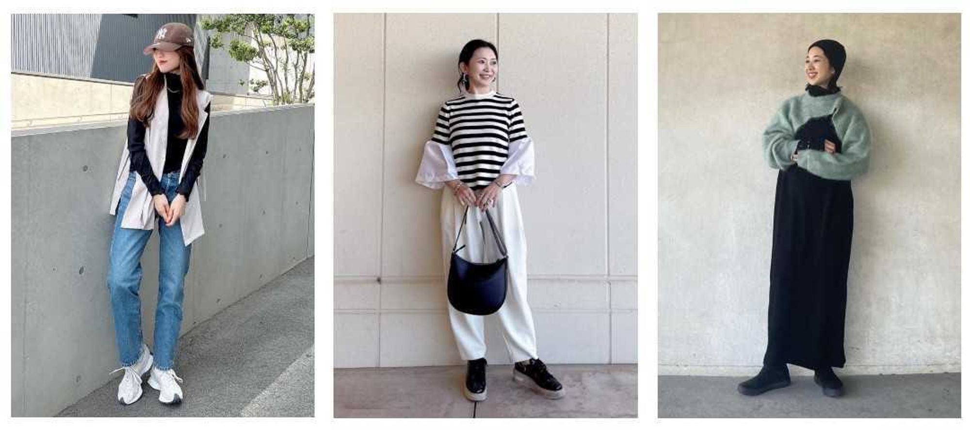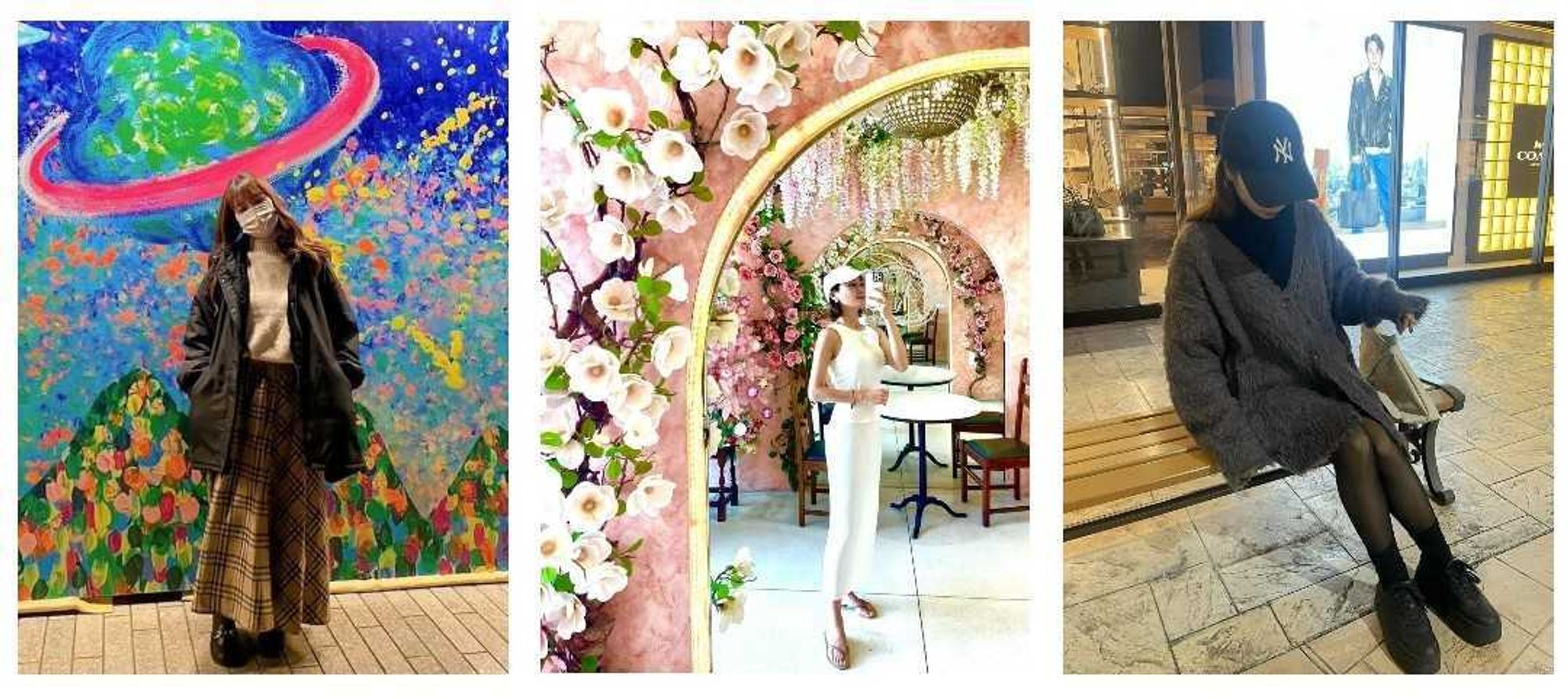 (左、中央)背景がごちゃごちゃしていて着用商品が目立たない (右)他店舗の看板・文字など不要なものが写りこんでいる