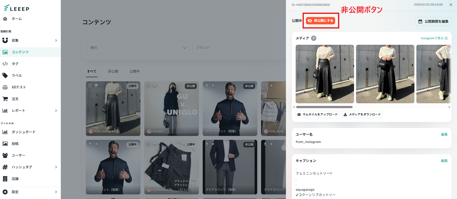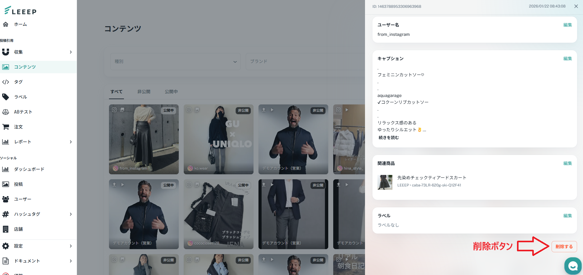 「削除するボタン」から投稿を削除しますと、再度コンテンツページに復元することはできかねてしまいます。