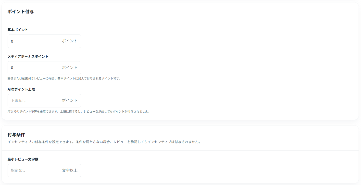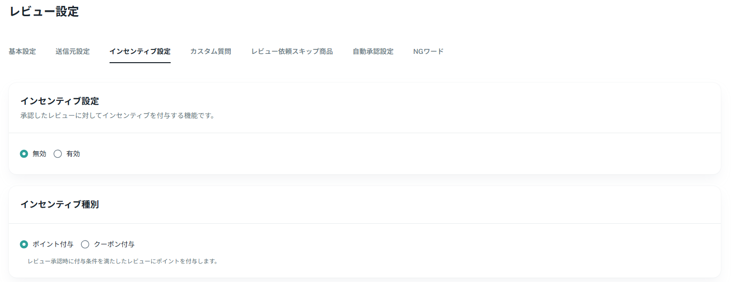 管理画面の「レビュー設定」にある「インセンティブ設定」タブから、本機能の有効/無効、各種ポイント数、および付与条件を設定できます。
