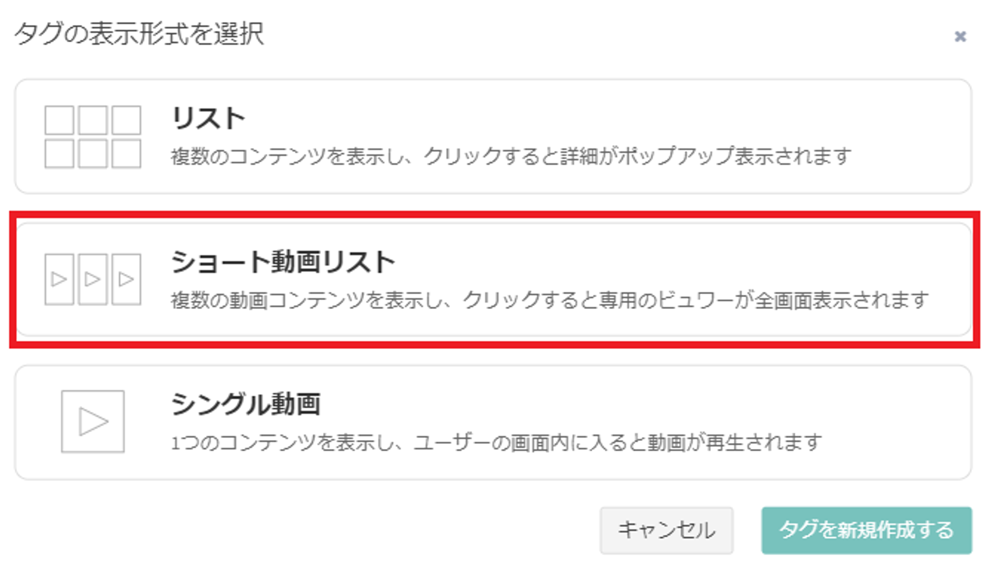 タグを新規作成する際に、中央の「ショート動画リスト」をご選択ください。