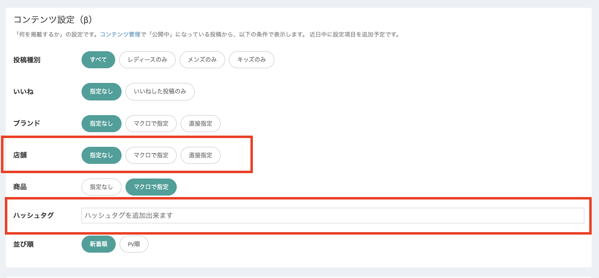 スタッフ投稿リストのコンテンツ設定に「店舗」と「ハッシュタグ」の指定が追加されました!