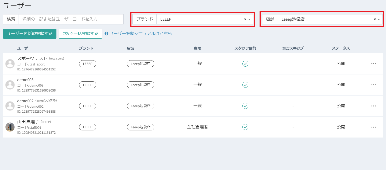 LEEEP管理画面内 スタッフ> ユーザー一覧画面にて、ブランド単位、店舗単位での絞り込みができるようになりました。また、検索機能とも組み合わせて利用可能です。