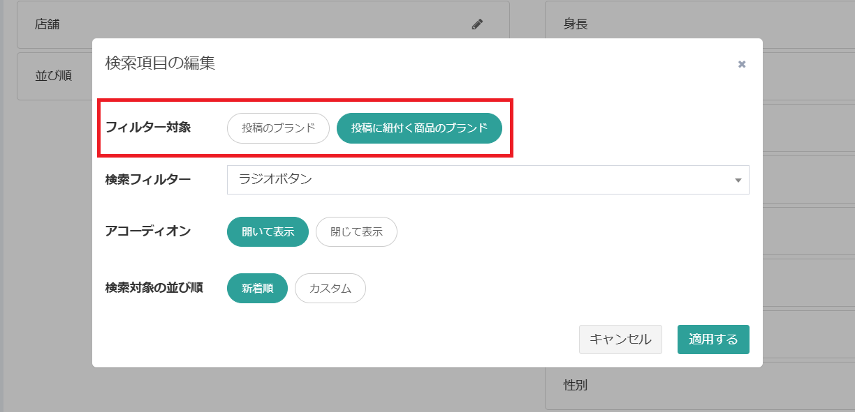 タグ編集画面で「ブランド」の検索項目を編集する際、フィルター対象として「投稿のブランド」または「投稿に紐付く商品のブランド」を選択できるようになりました(画像1、画像2)。