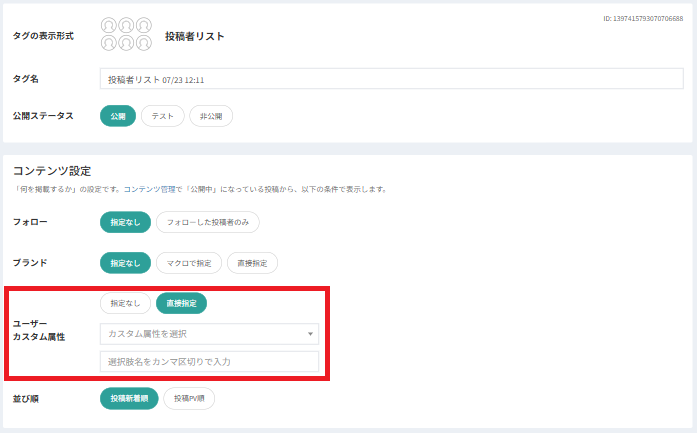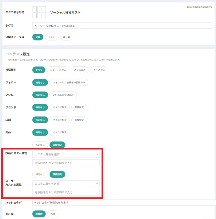 ソーシャル投稿リストと投稿者リストのコンテンツ設定に、新たにカスタム属性が追加されました。この機能により、投稿やユーザーをより詳細にフィルタリングできるようになります。