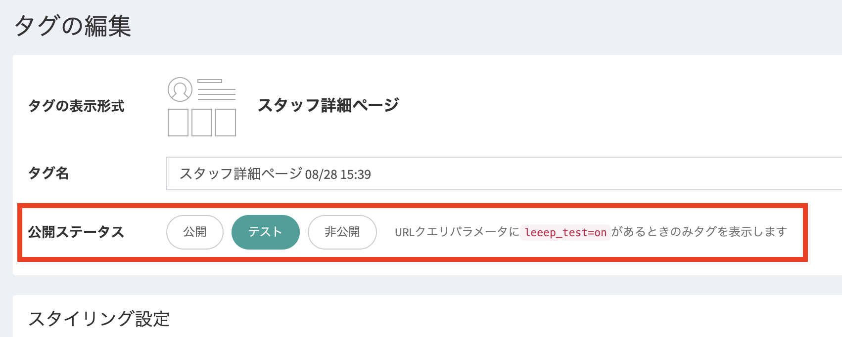 leeep_test=onを追加した場合のみタグが表示されます。本番サイトで動作を確認したいが、まだ一般のお客様には見せたくない場合に最適です。非公開:タグが表示されなくなります。