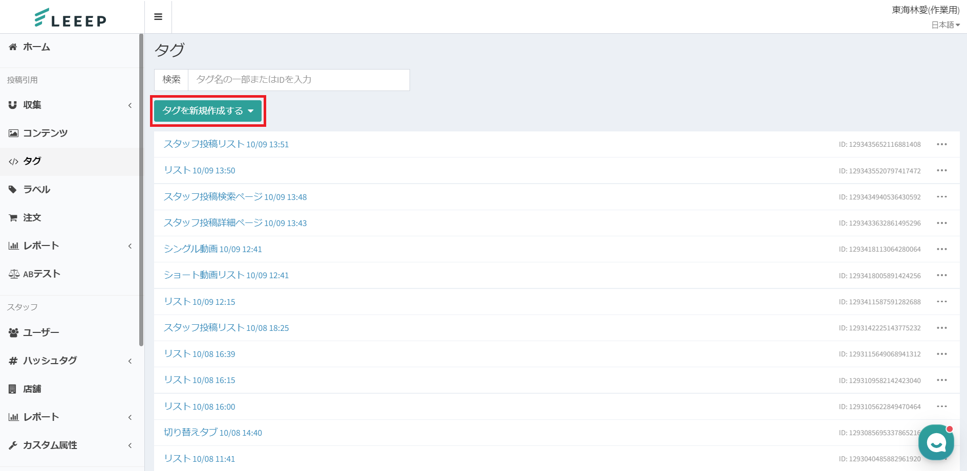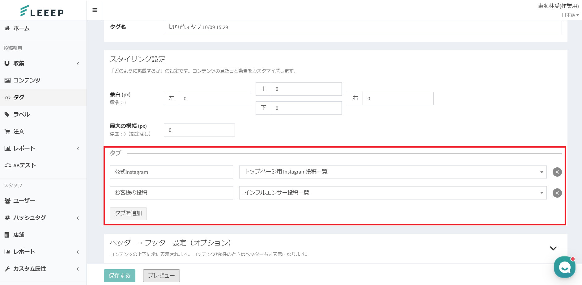 作成済みのタグを複数選択し、タブで切り替えることが可能です。