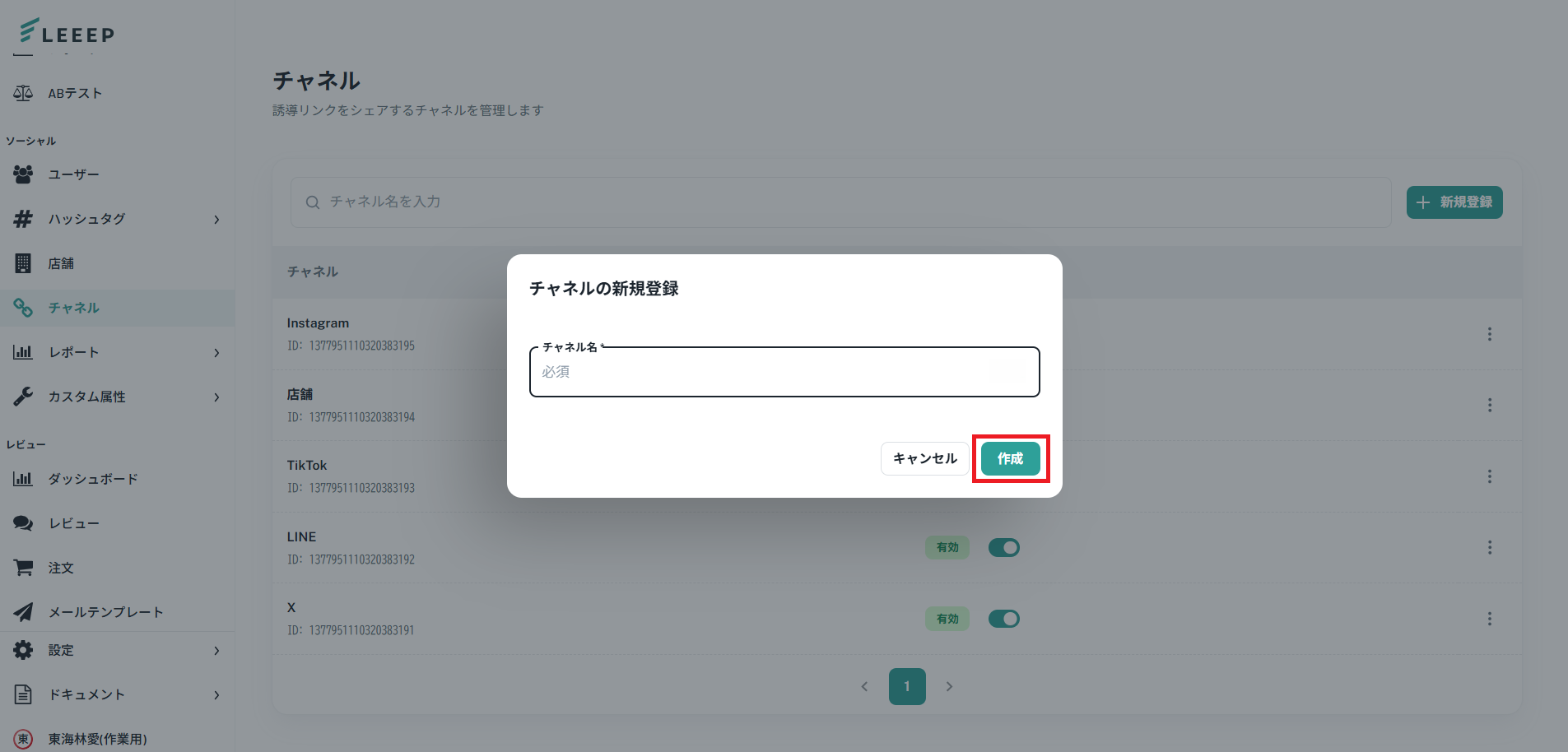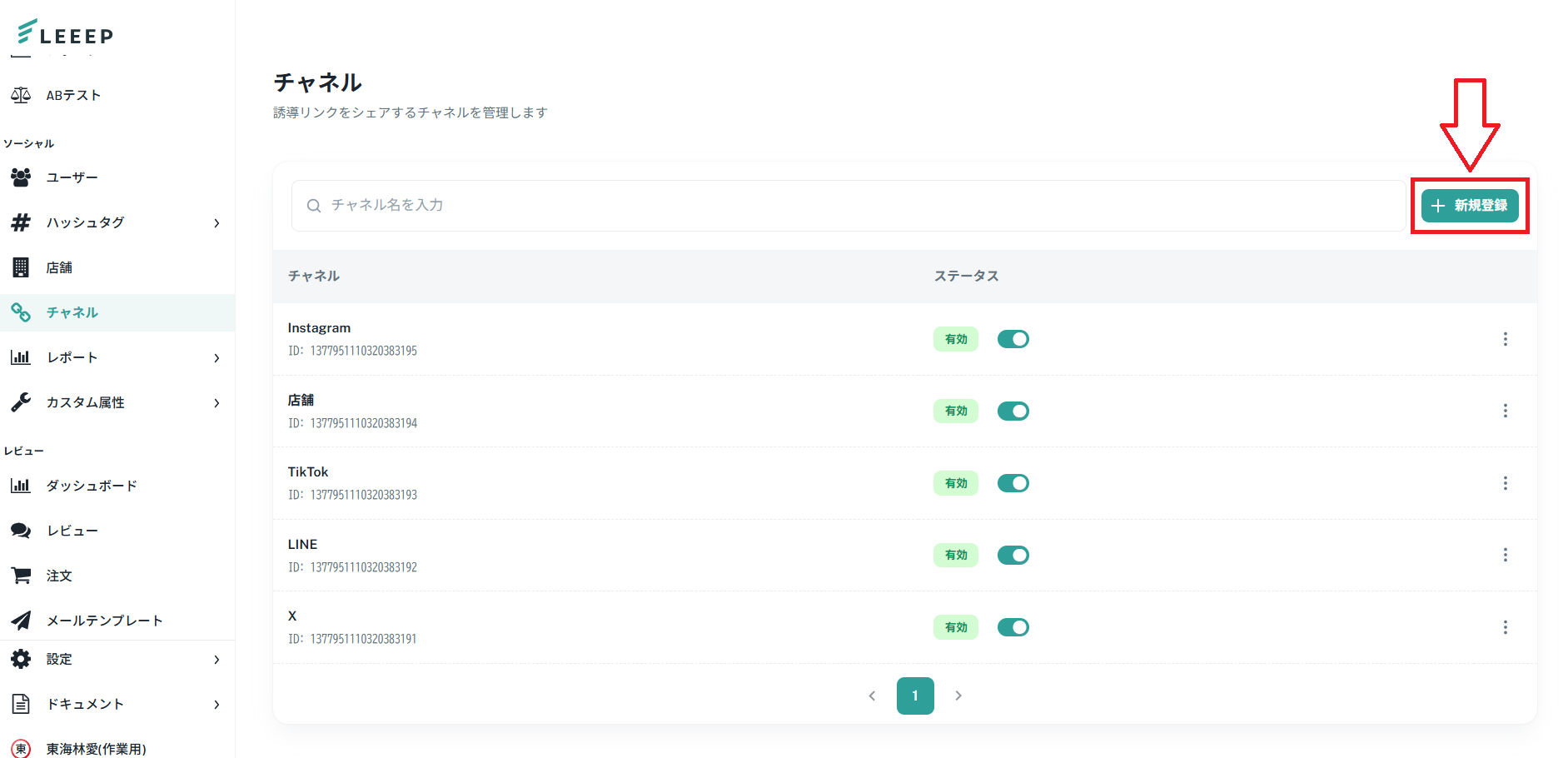 1.管理画面「ソーシャル」>「チャネル」の「新規登録」をタップしてください。