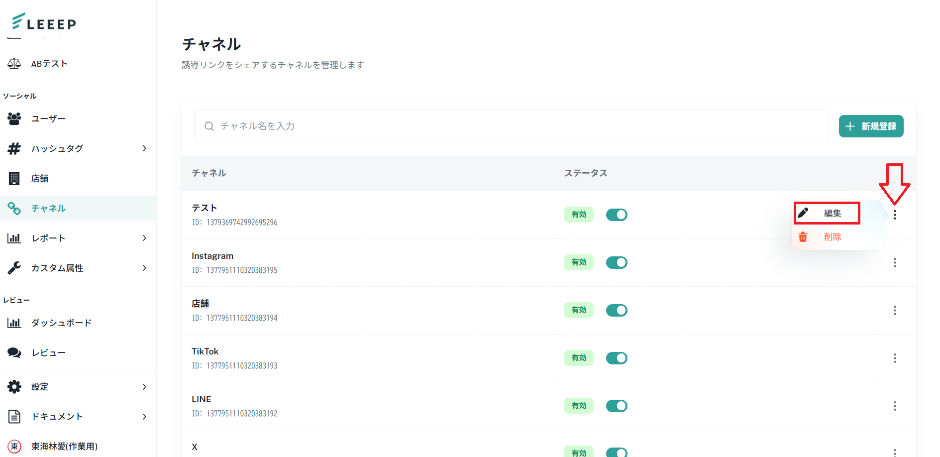 1.管理画面「ソーシャル」>「チャネル」より、編集したいチャネルの右側に表示されている「 ⋮ 」をタップし、「編集」を選択してください。
