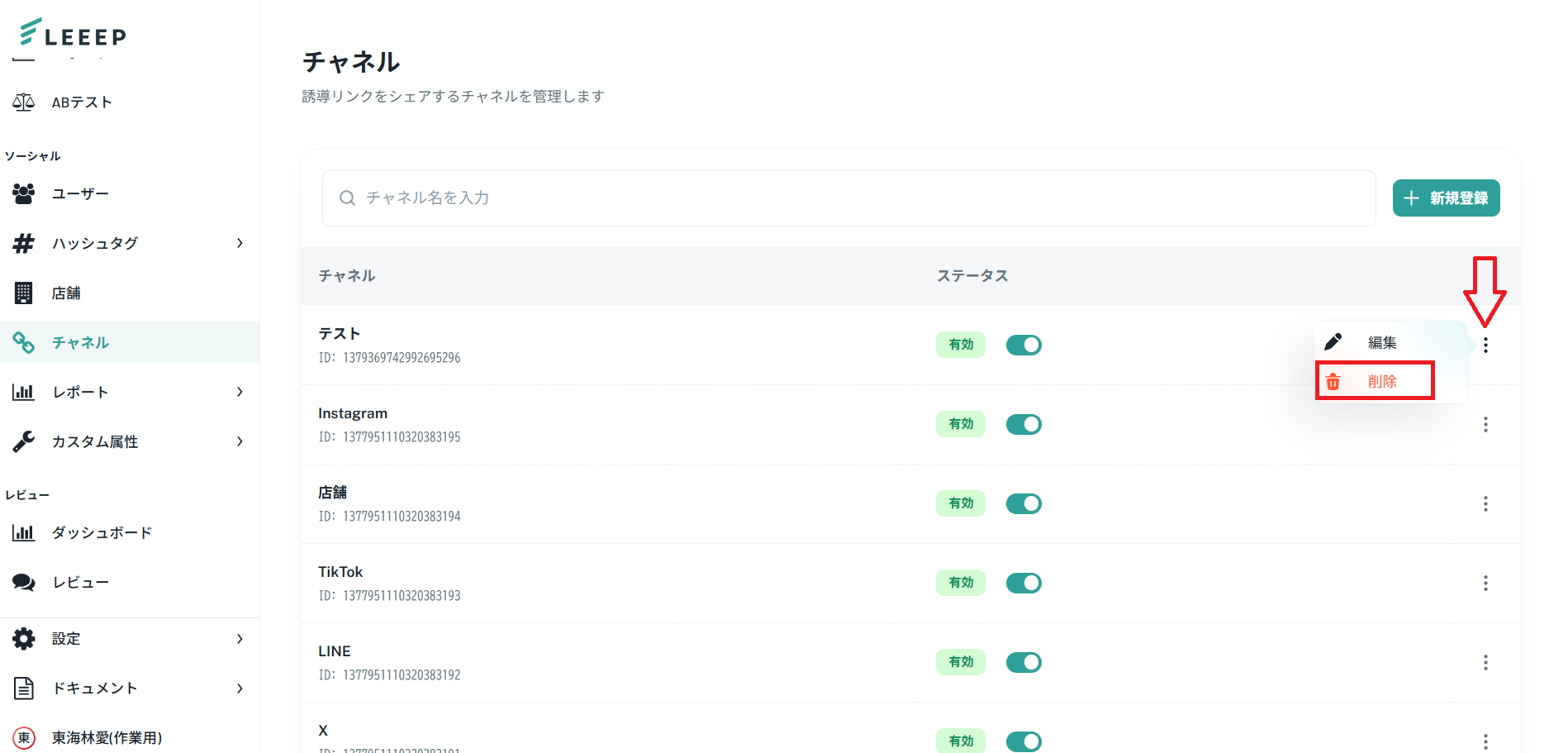 1.管理画面「ソーシャル」>「チャネル」より、削除したいチャネルの右横に表示されている「 ⋮ 」をタップし、「削除」を選択してください。