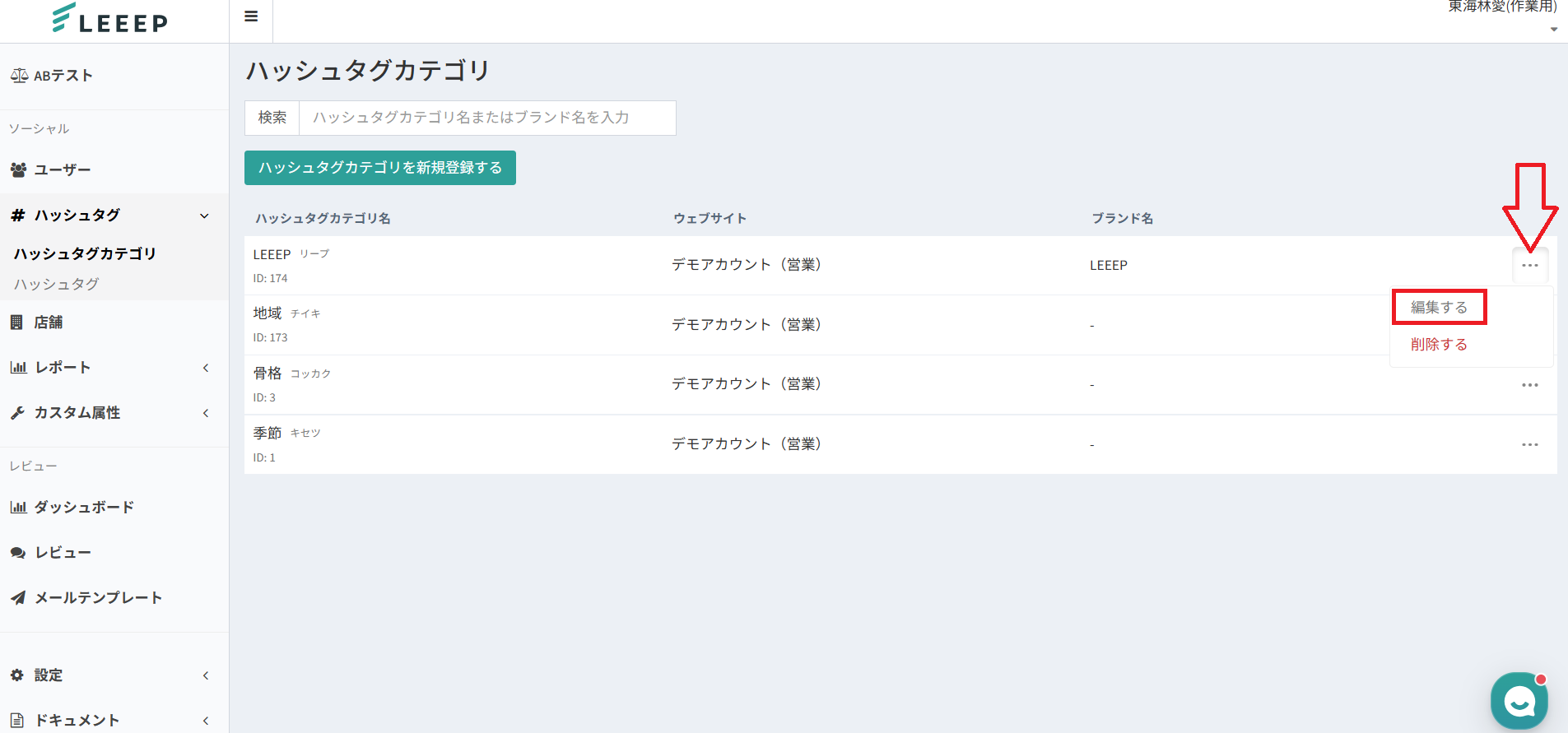 1.管理画面「ソーシャル」>「#ハッシュタグ」>「ハッシュタグカテゴリ」の「⋯」をタップ後、「編集する」を選択してください。