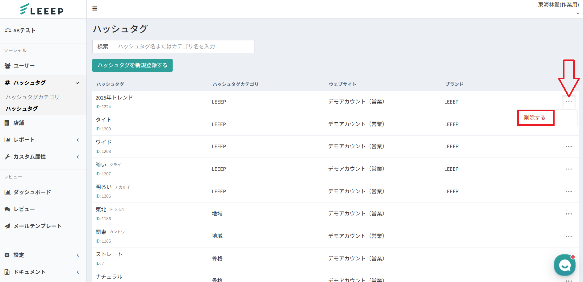 1.管理画面「ソーシャル」>「#ハッシュタグ」>「ハッシュタグ」の「⋯」をタップ後、「削除する」を選択してください。