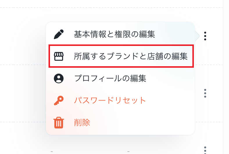 編集画面を開く: ユーザー一覧画面にて、対象スタッフの右横にある「︙」をクリックし、「所属するブランドと店舗の編集」を選択します。