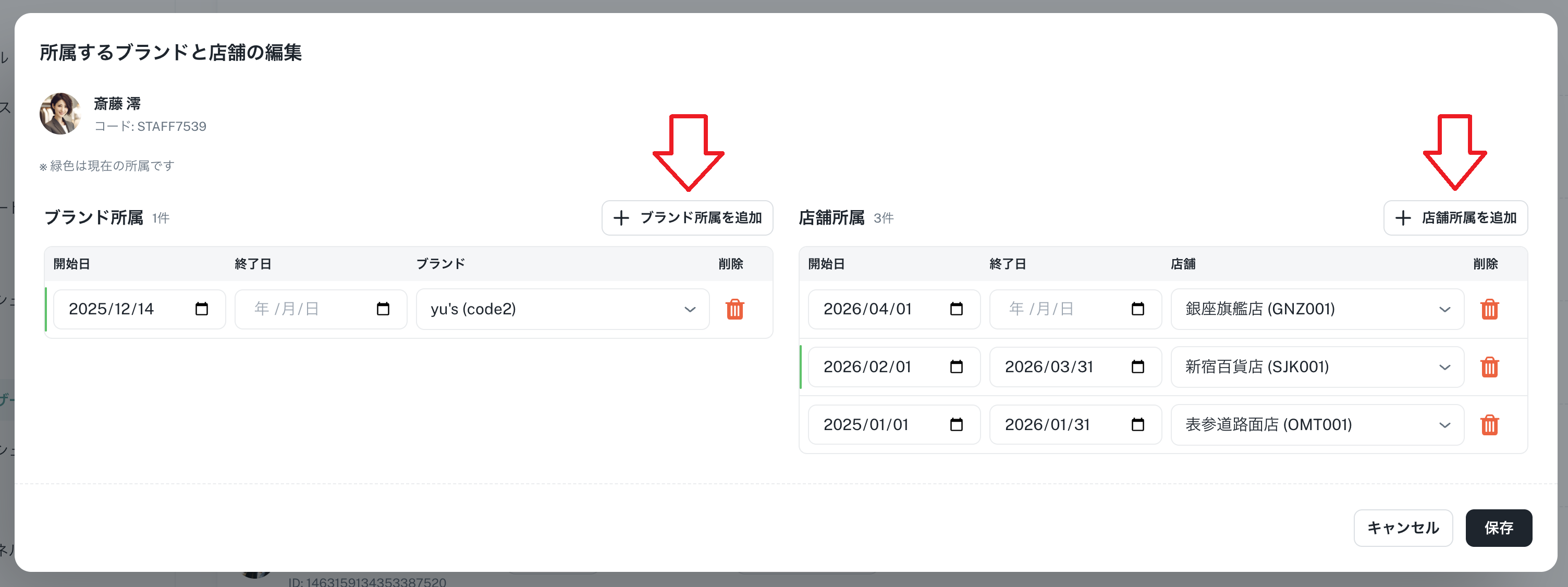所属の追加: 「+ブランド所属を追加」または「+店舗所属を追加」ボタンをクリックして、新しい所属枠を作成します。