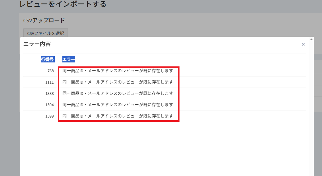 CSVインポート時に、「同一商品ID・メールアドレスのレビューが既に存在します」というメッセージが表示された場合は、同一人物による同一商品のレビューが複数含まれていないかをご確認ください。