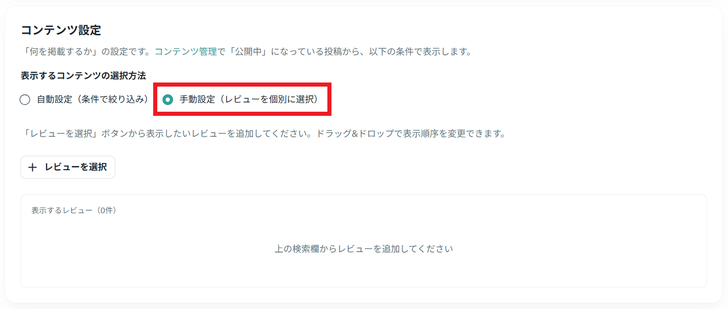新しい「手動設定」: 管理画面で選んだ特定のレビューだけを、選んだ順番で表示する。