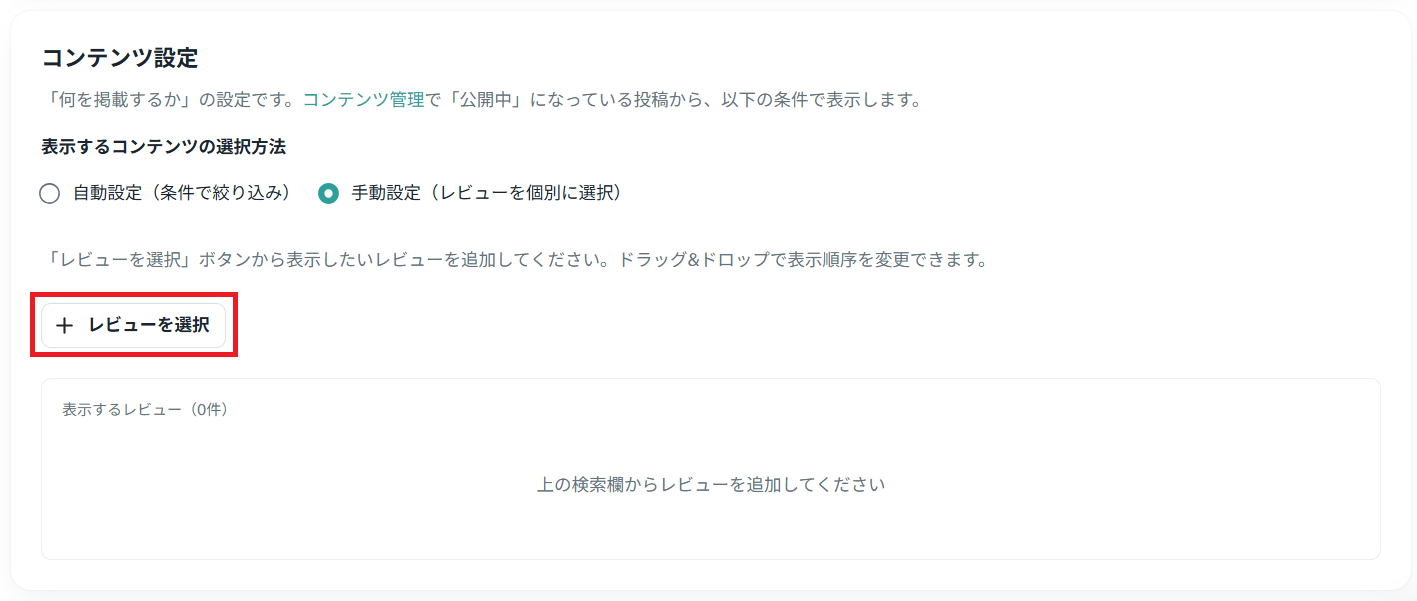 「手動設定」を選択すると表示される [+レビューを選択] ボタンをクリックします。