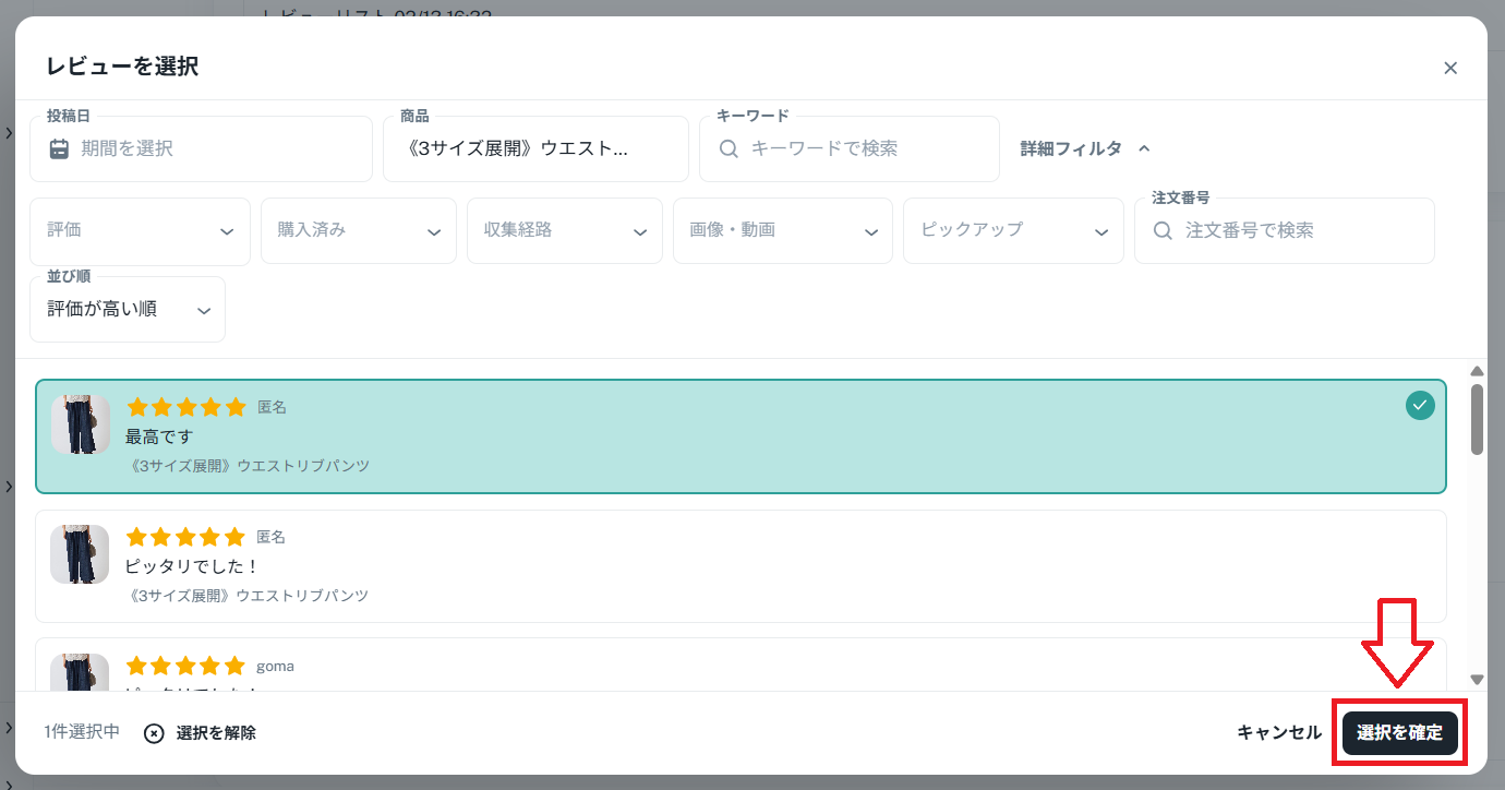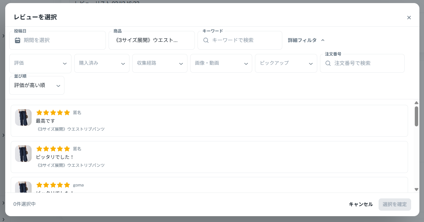 ポップアップ画面で、商品名・評価・キーワード・投稿日などで絞り込み、掲載したいレビューにチェックを入れます。