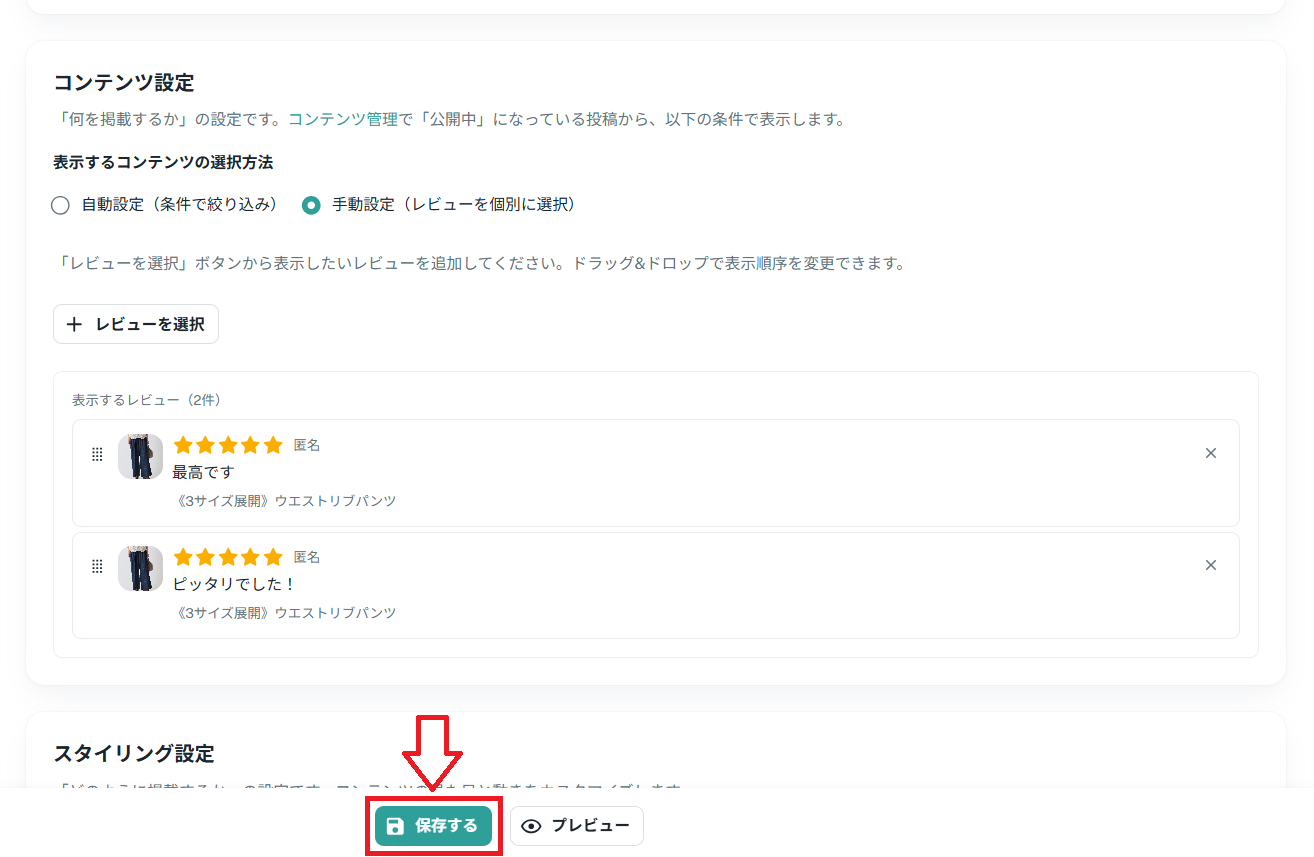 選択したレビューが「表示するレビュー」に並んでいることを確認します。