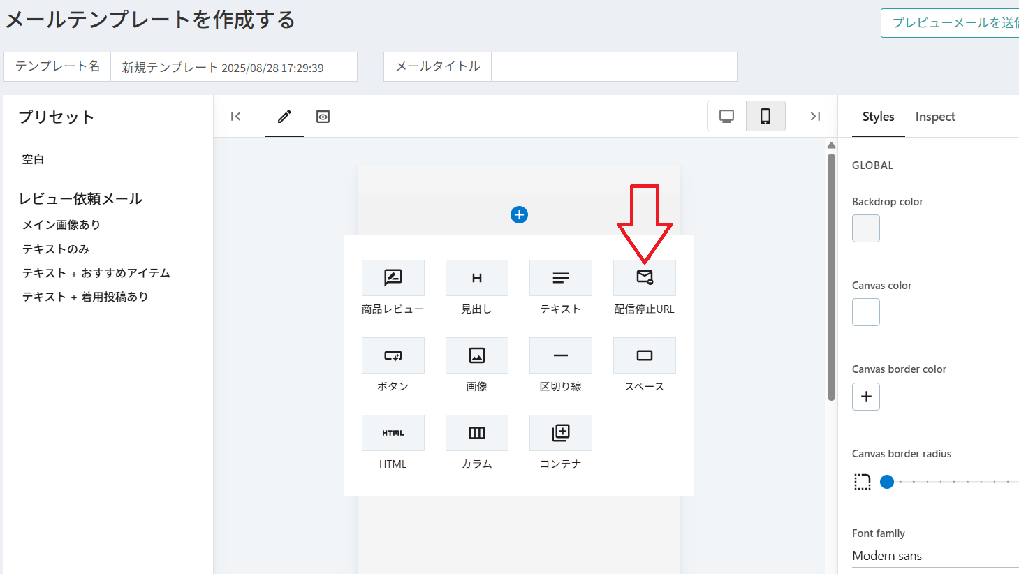メールテンプレート作成時に「配信停止URL」ブロックを選択すると、「メールの配信停止をご希望の方はこちらをクリックしてください。」という文言が自動的に追加されます。