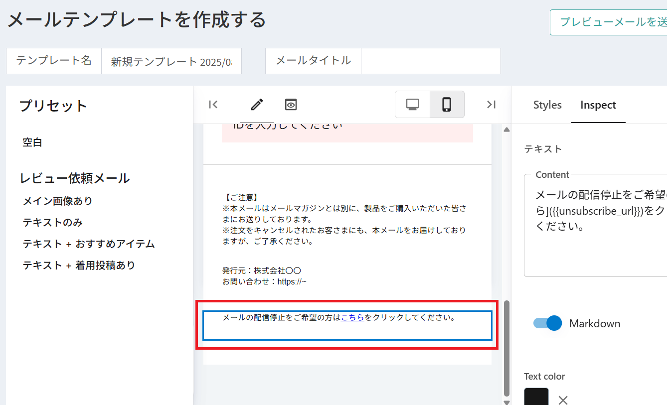 手動でリンクを埋め込みたい場合は {{unsubscribe_url}} を指定すると、メール送信時に具体的なリンクに置き換わります。