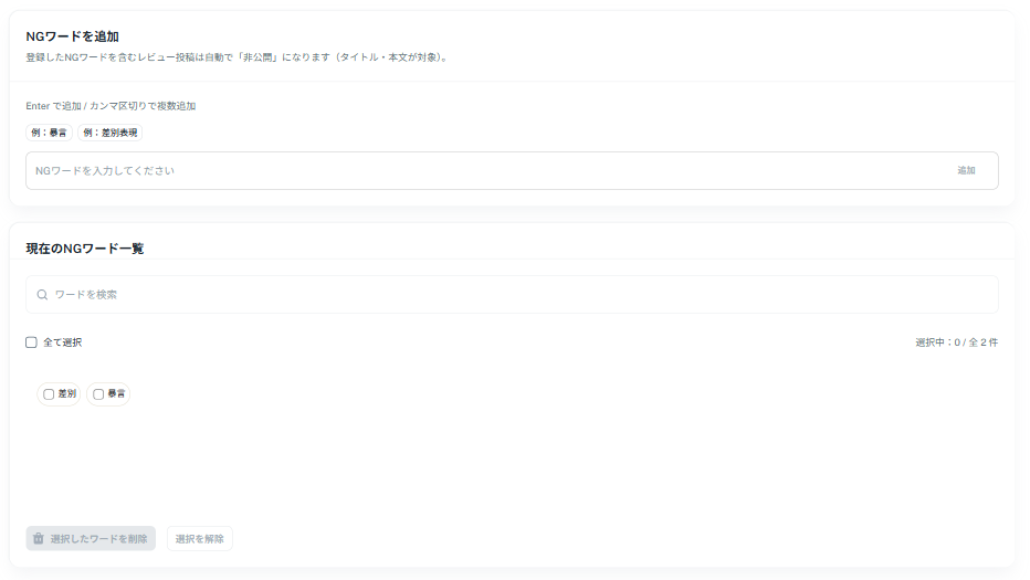 レビュー投稿時に、タイトルと本文に対してNGワードチェックが実行されます。NGワードが含まれる場合、レビューは自動的に非公開になり、表示されません。