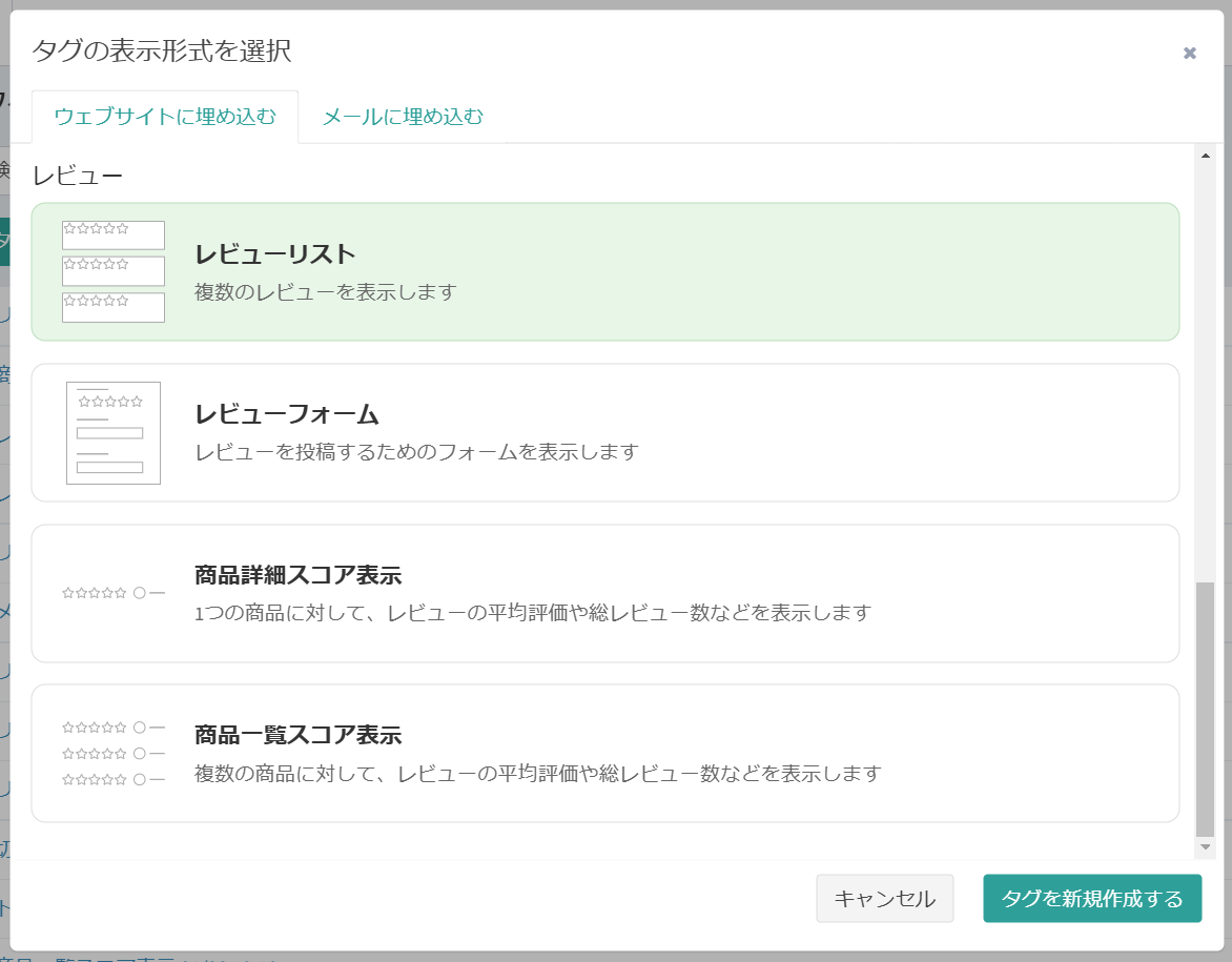 タグの表示形式で「レビューリスト」 「レビューフォーム」を選択した場合に設定可能です。