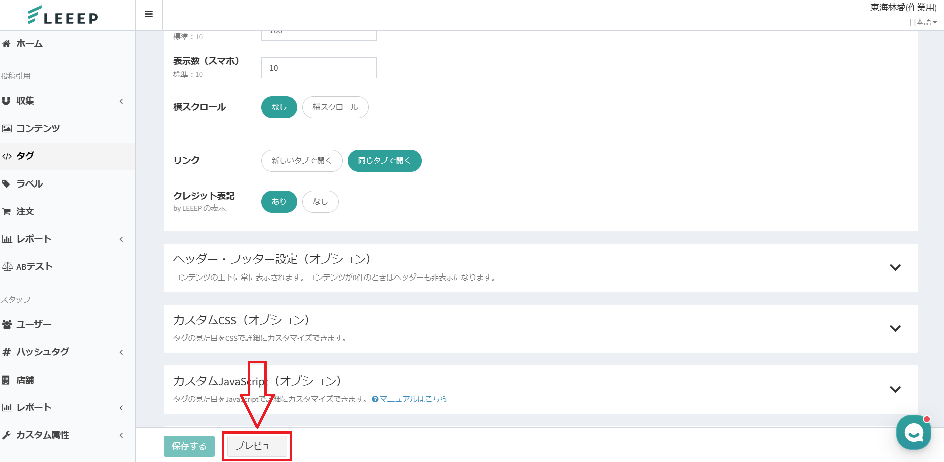 タグ画面中部にある、「プレビュー」を押下すると別タブで開きます。