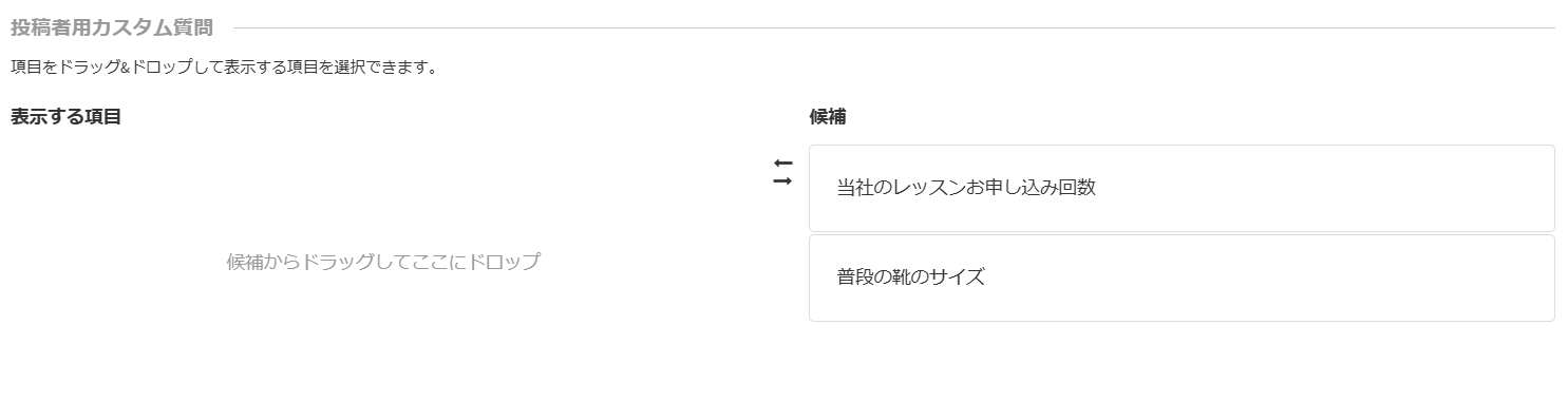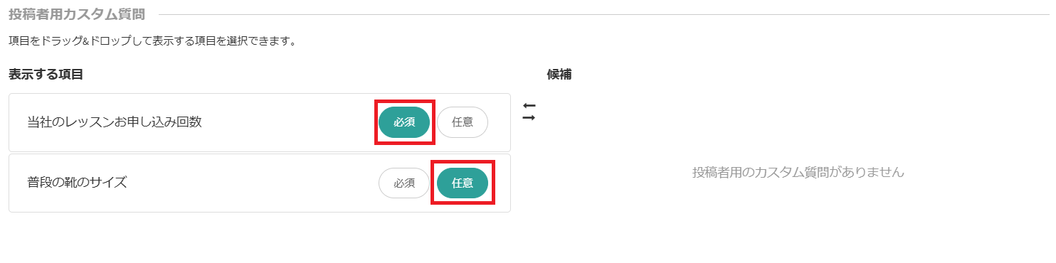 「表示する項目」に移動後、その質問への回答の「必須/任意」設定ができます。