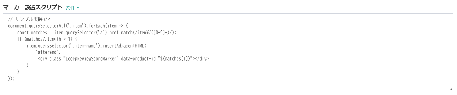 サンプル実装を参考に、レビュースコアを表示したい箇所に以下のマーカーDOMを設置してください。