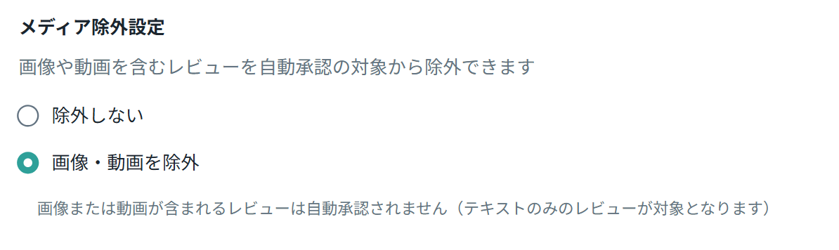 「画像・動画を除外」: 画像または動画が含まれるレビューは自動承認されません(テキストのみのレビューが対象)