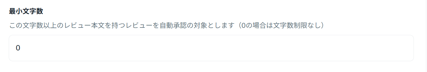 説明: この文字数以上のレビュー本文を持つレビューを自動承認の対象とします