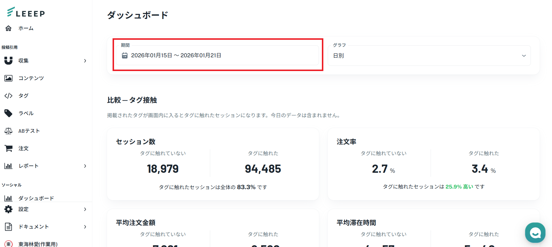 期間指定: 画面左上のプルダウンから、分析したい期間を変更・指定できます。