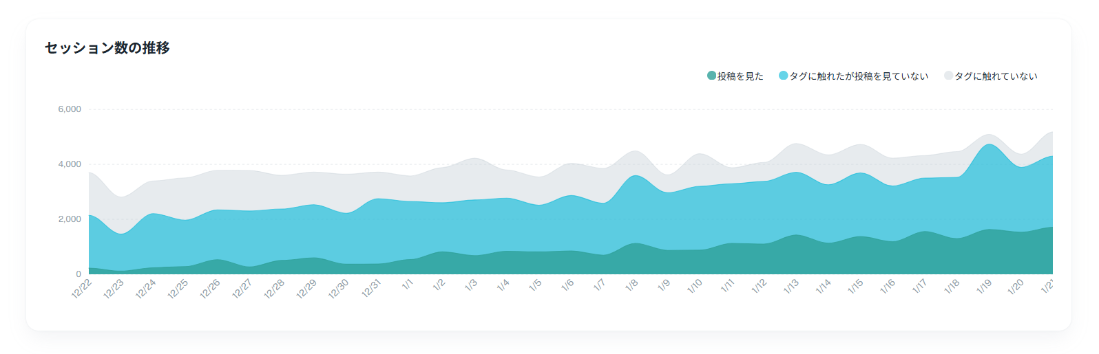 セッション数の推移: 「タグ接触」や「投稿閲覧」に至ったユーザー数の推移をグラフで確認できます。