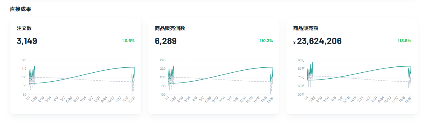 コンテンツを経由した「注文数」「商品販売個数」「商品販売額」の推移を折れ線グラフで確認できます。どの程度の売上に貢献しているかをダイレクトに把握することが可能です。