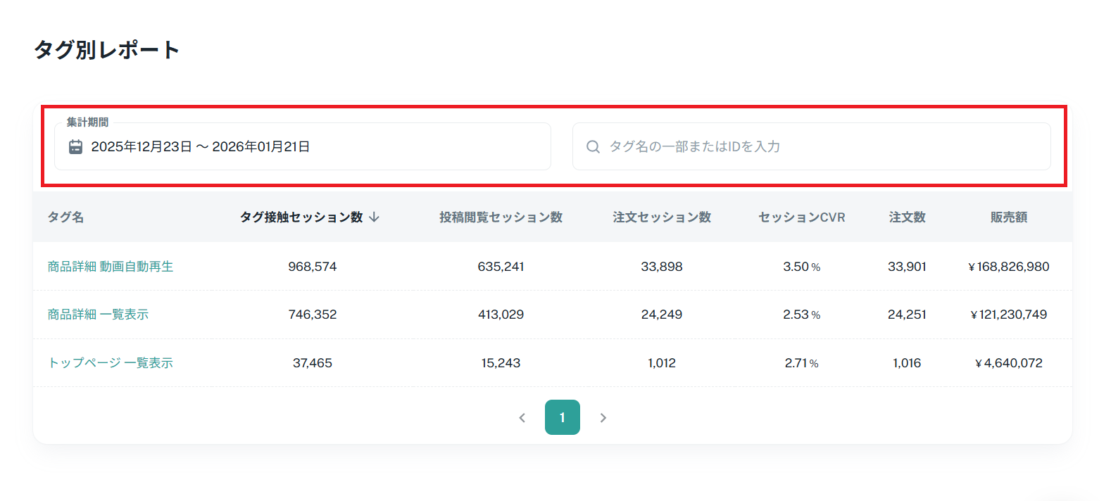タグの絞り込み: 複数のタグを設置している場合、特定のタグのみに絞り込んで表示することが可能です。